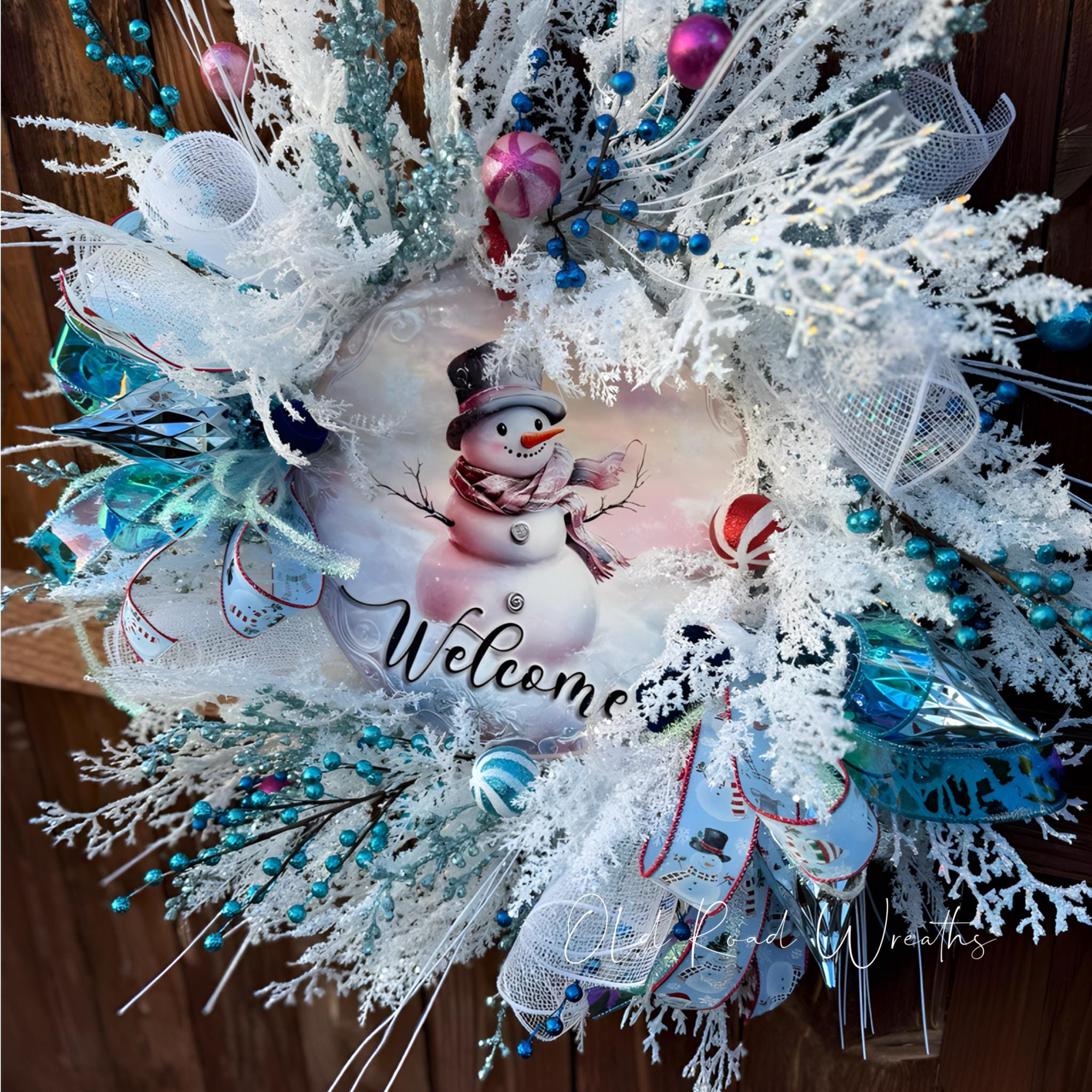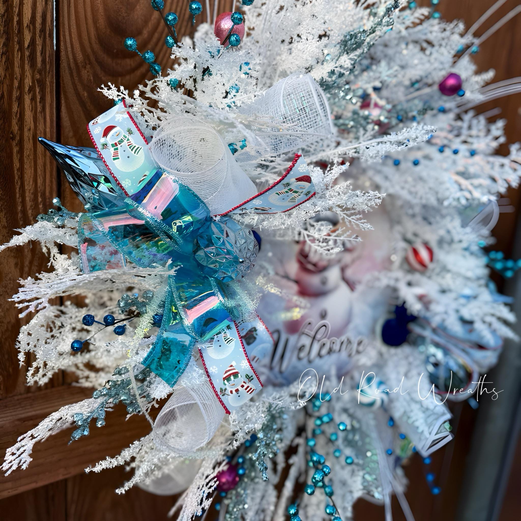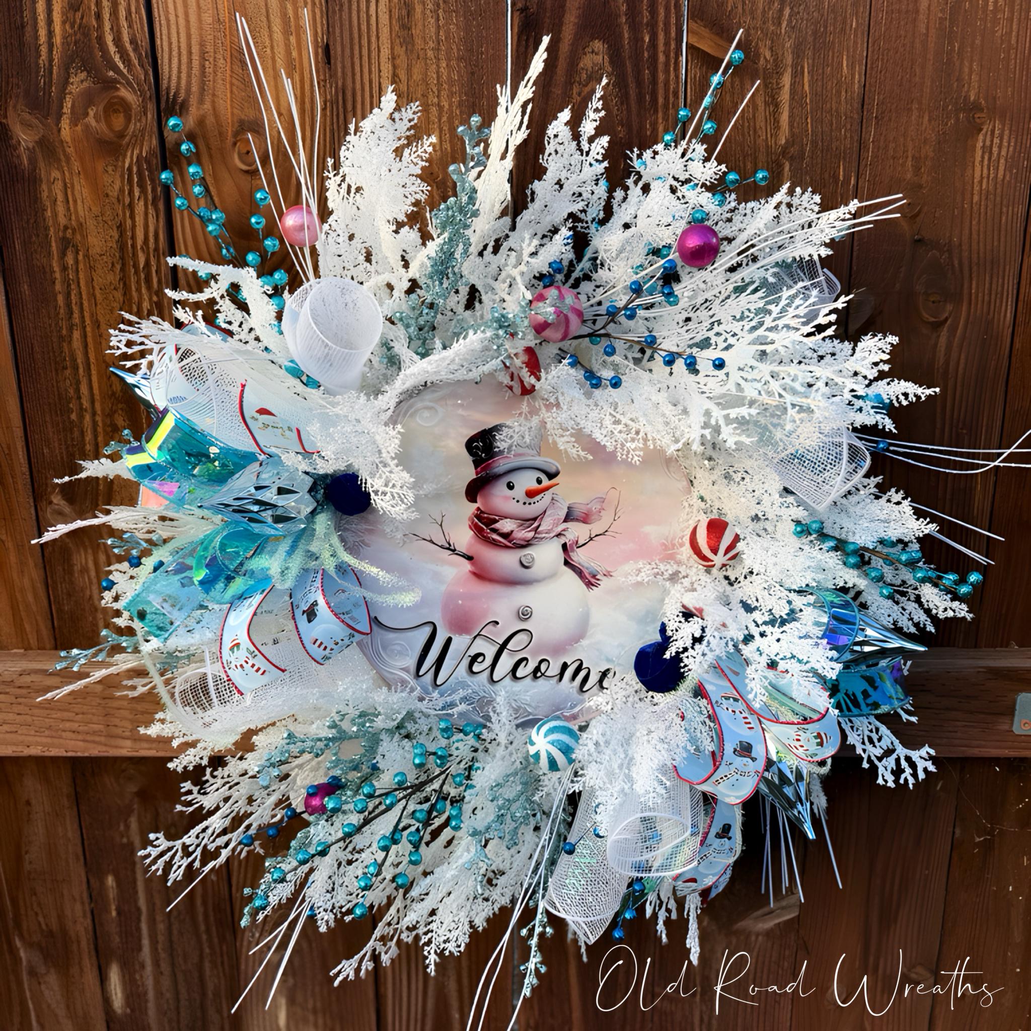 Snowman wreath with glittered and frosted foliage & picks.