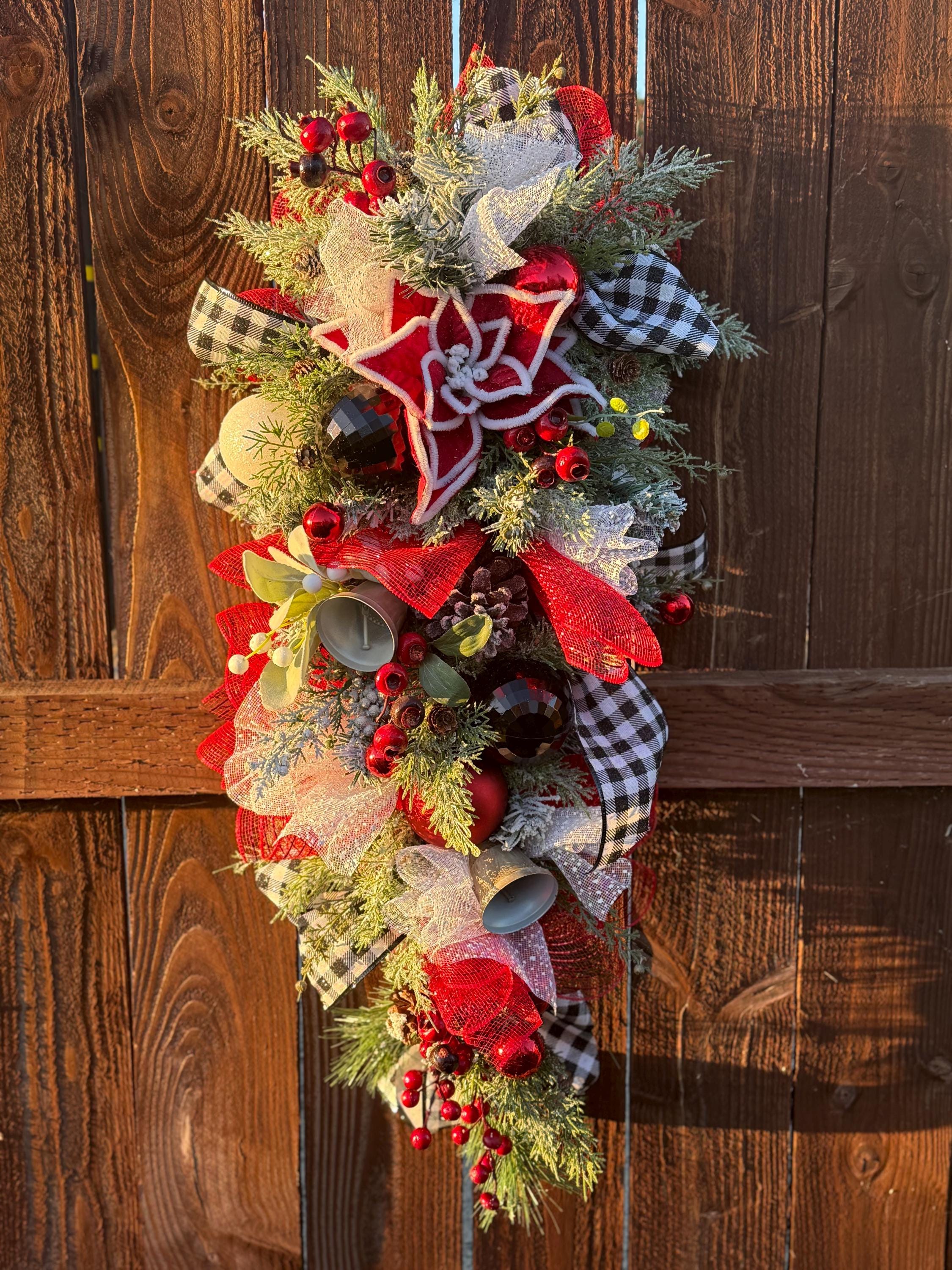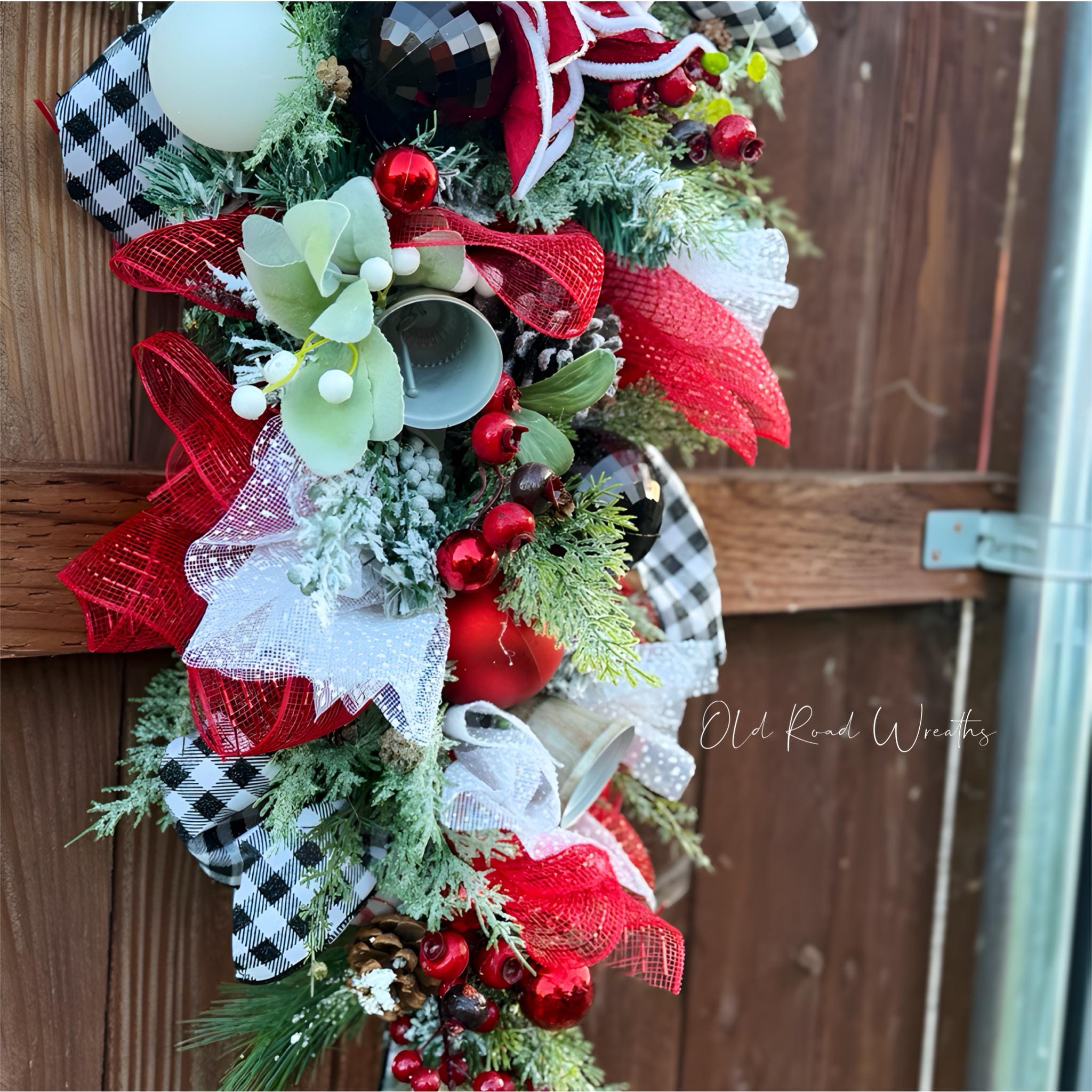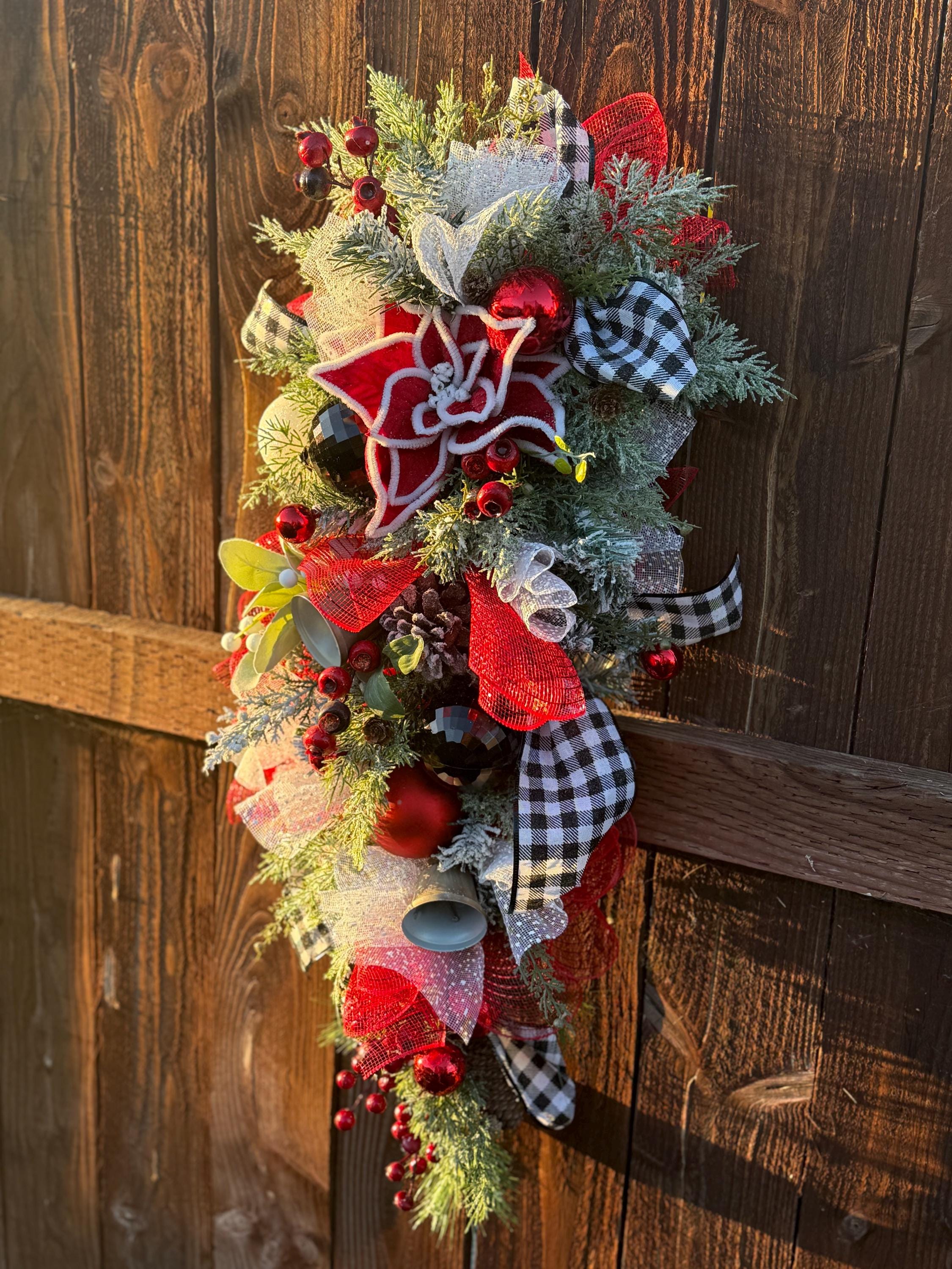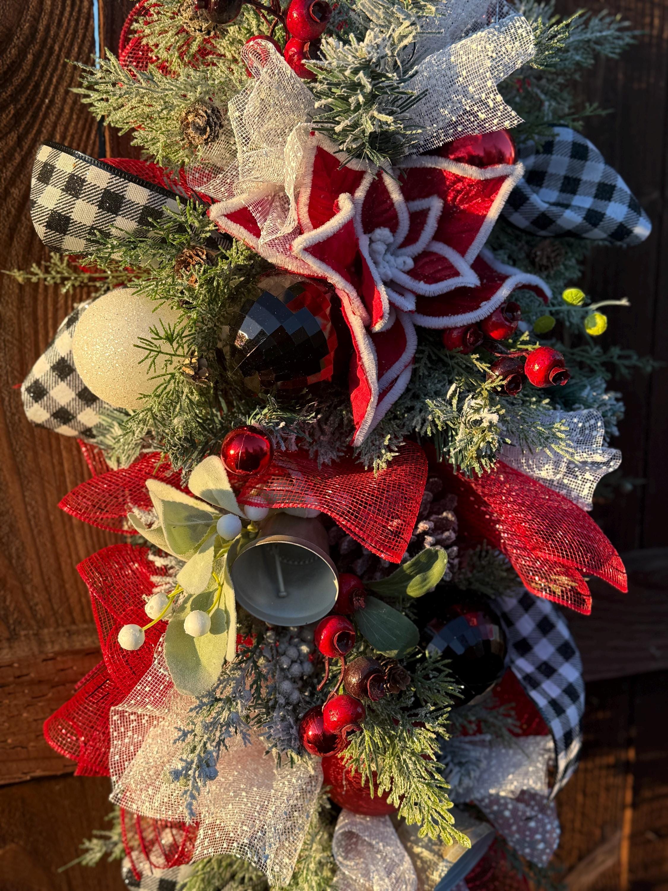 Plaid holiday swag. Reds, whites, and black colors on flocked foliage.